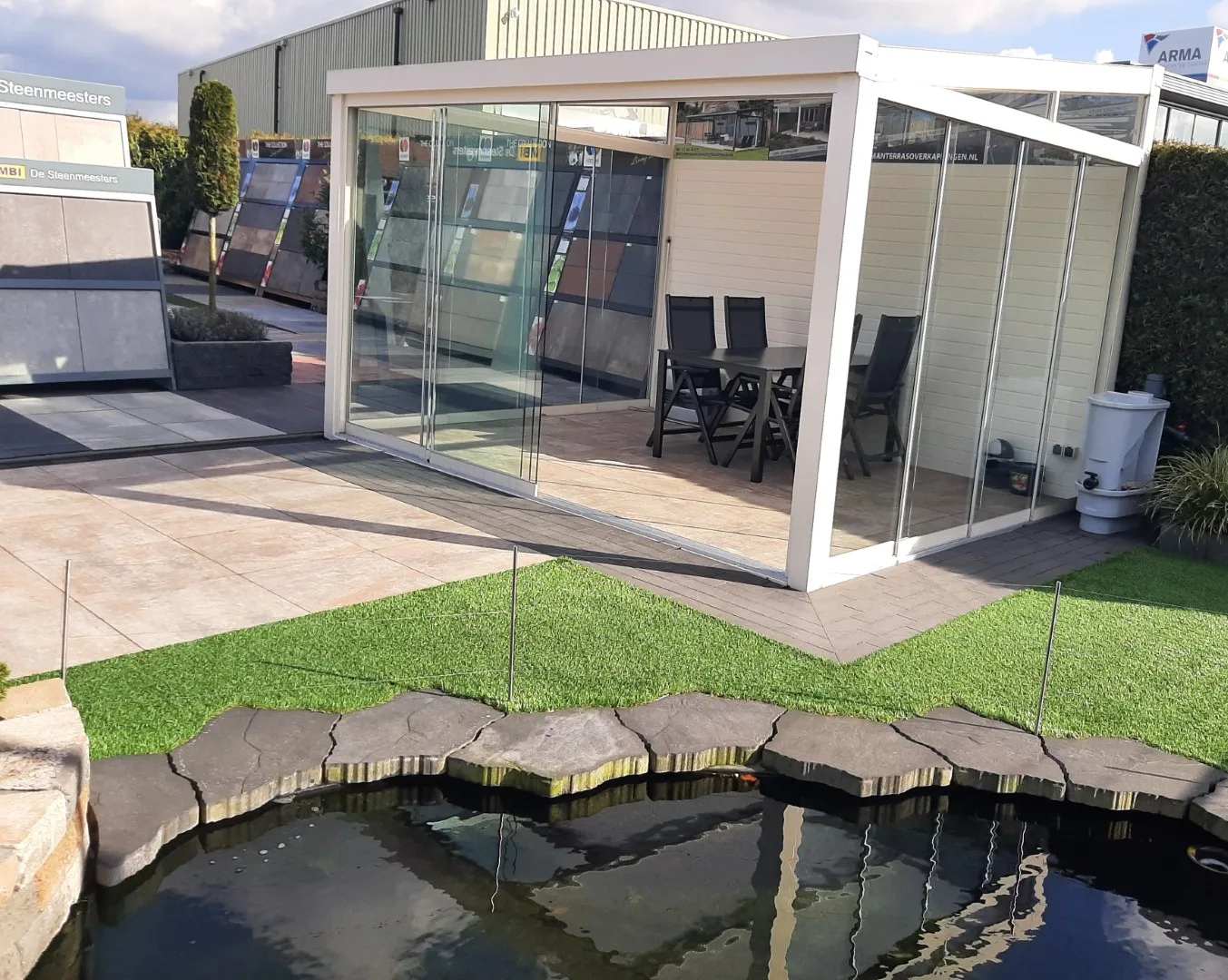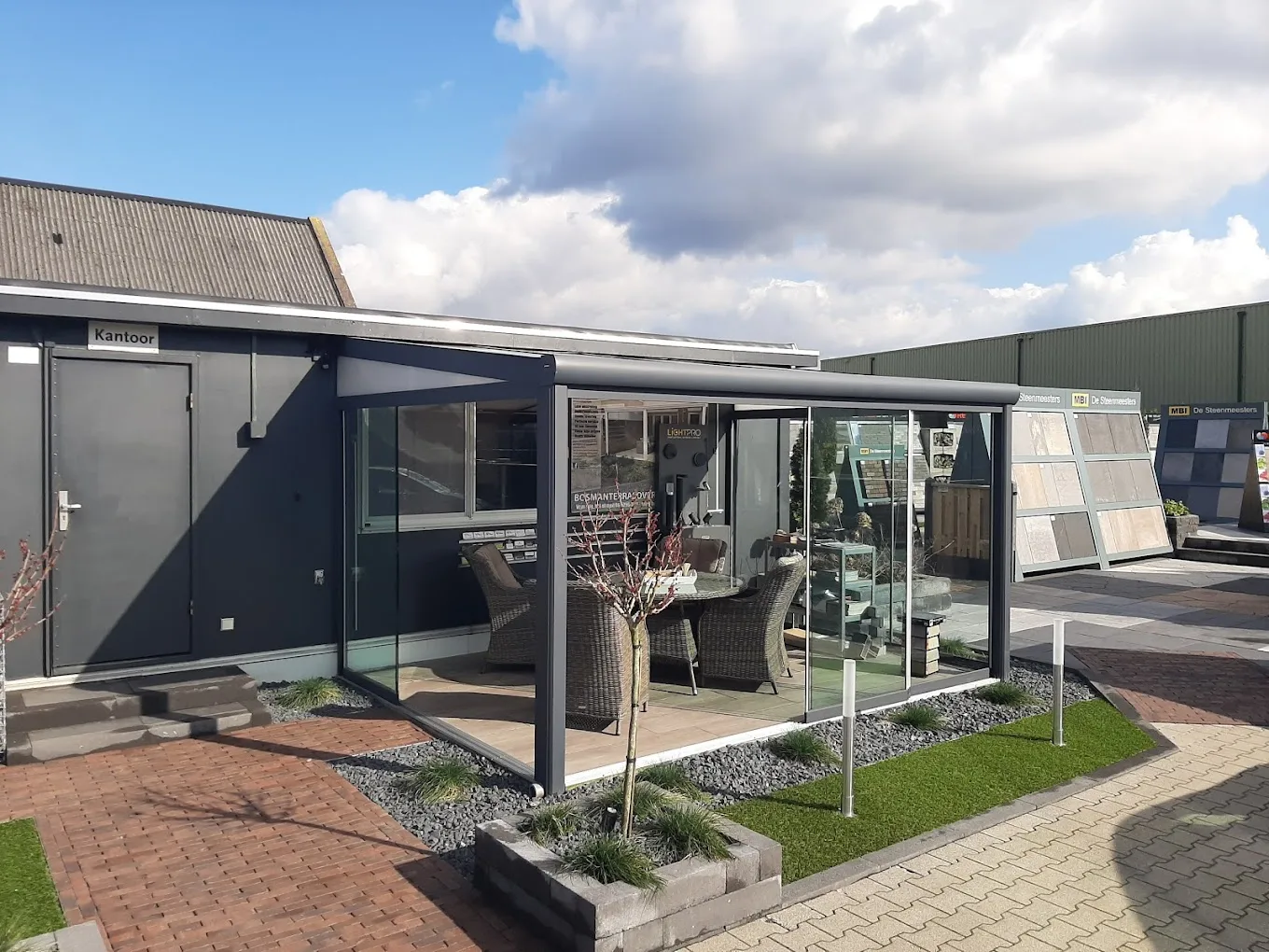 Voor (sier)bestrating verwijzen wij je graag door naar The Stone Discounter in Nunspeet. Hier staan tevens 2 demo aluminium terrasoverkappingen van ons.